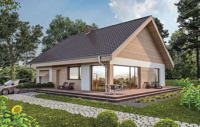Pred záhradou je veľká terasa, kde si môžete vychutnať výhľad a kávu na čerstvom vzduchu. Priaznivci veľkého zasklenia môžu jednoducho vymeniť všetky okná v spálni a obývačke za terasové. Potom sa tiež oplatí predĺžiť terasu, aby ste na ňu mohli vyjsť odkiaľkoľvek.