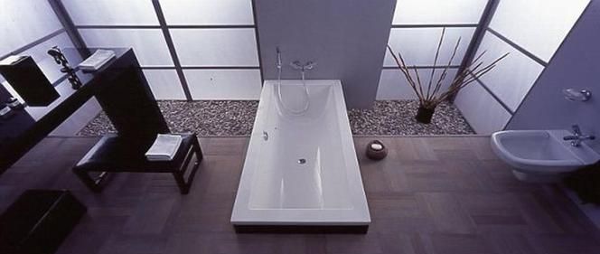 Kúpelňa s dvoma podlažiami je ponuka pre excentov, obdivovateľov novosti a rizika. Všetko je tu šok: podlahový krok označujúci dve „podlahy“ kúpeľne, usporiadanie vane a pracovnej dosky s umývadlom na vstupnej osi a skutočnosť, že na dokončenie interiéru neboli použité dlaždice ani terakota. Podlaha je vyrobená z exotického tauárskeho dreva alebo rozliatých riečnych kameňov, steny boli natreté nepremokavou farbou. Doska na umývadlo a vaňu je vyrobená z čiernej leštenej žuly „nero Zimbabwe“, ktorá pripomína lesklý lak. Posuvné vstupné dvere a horizontálne delenie veľkých okien sú spojené aj s interiérom japonského domu. Najzaujímavejším riešením tejto kúpeľne je dvojpodlažná podlaha.