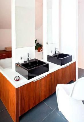 Jednoduché tvary nábytku a vybavenia sú doplnené jednoduchými farebnými kombináciami. Biela a čierna - použitie tohto kontrastu sa použilo na určenie hlavného miesta v miestnosti - ústredným bodom sa stala doska s umývadlami. Zaujímavé je použitie drevenej dyhy s čírym, tmavozrnným vzorom - vďaka nej najjednoduchší kontrast získa hĺbku